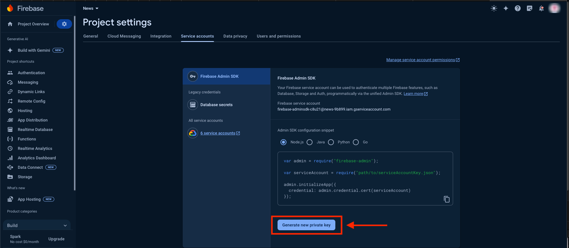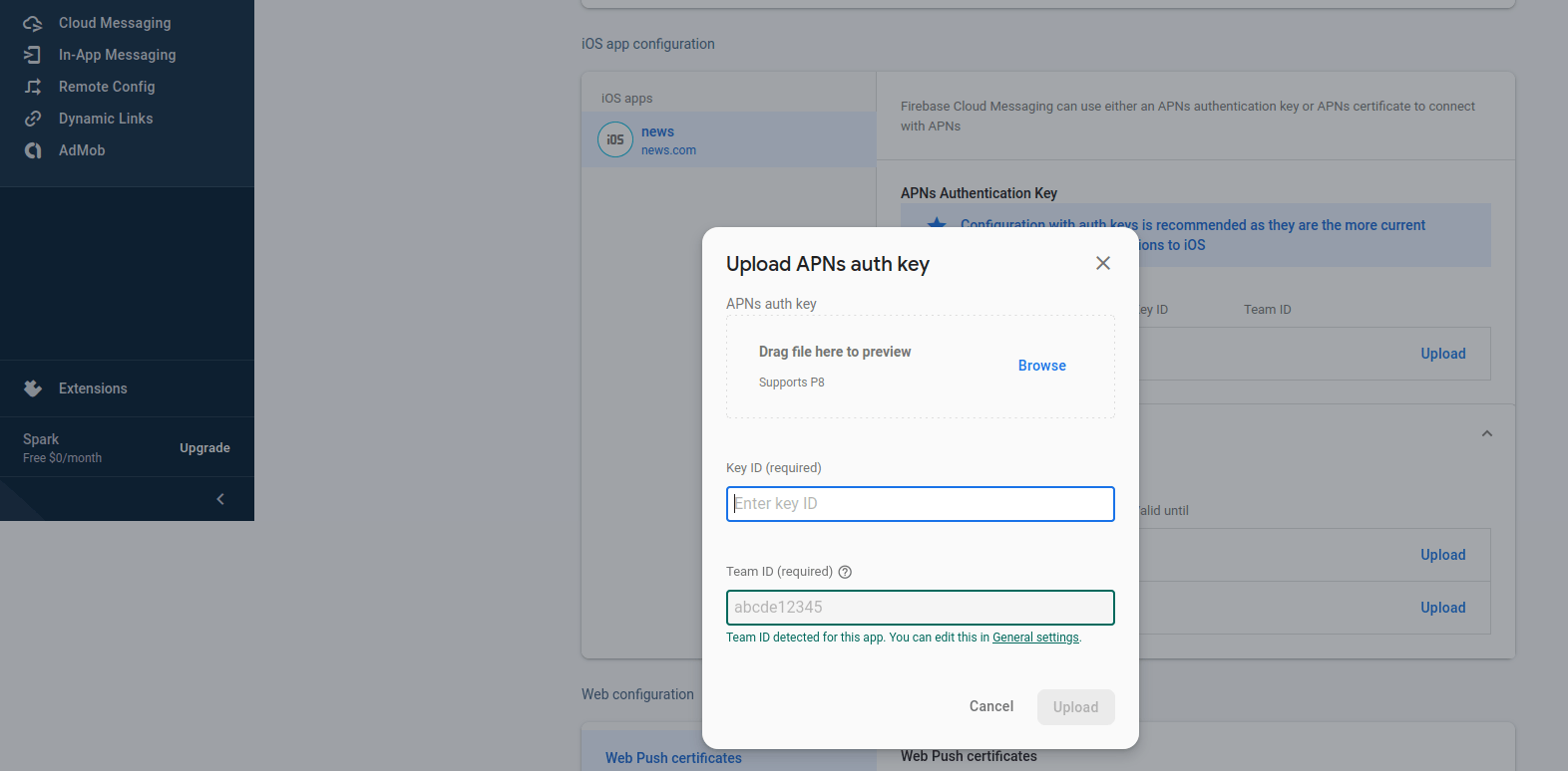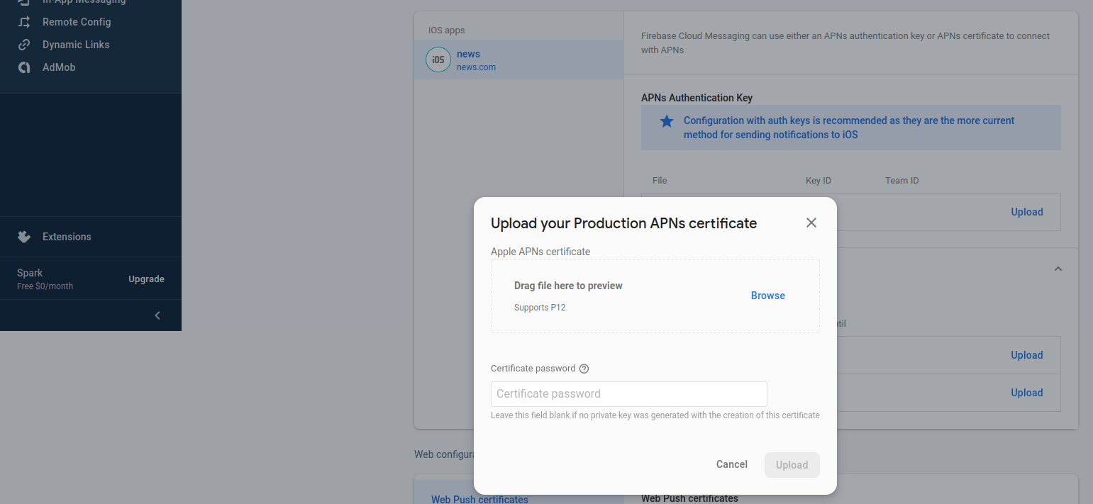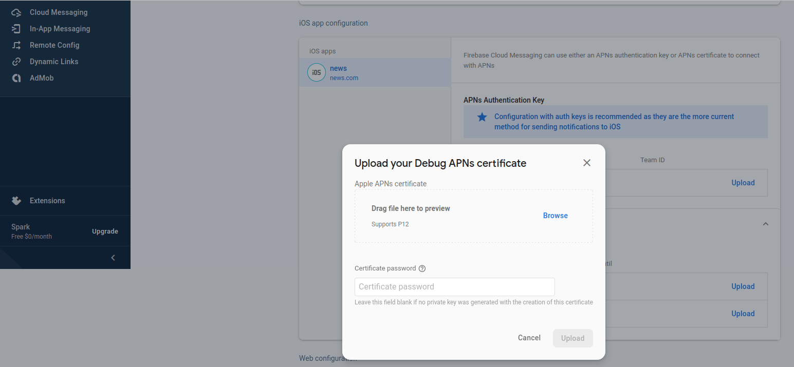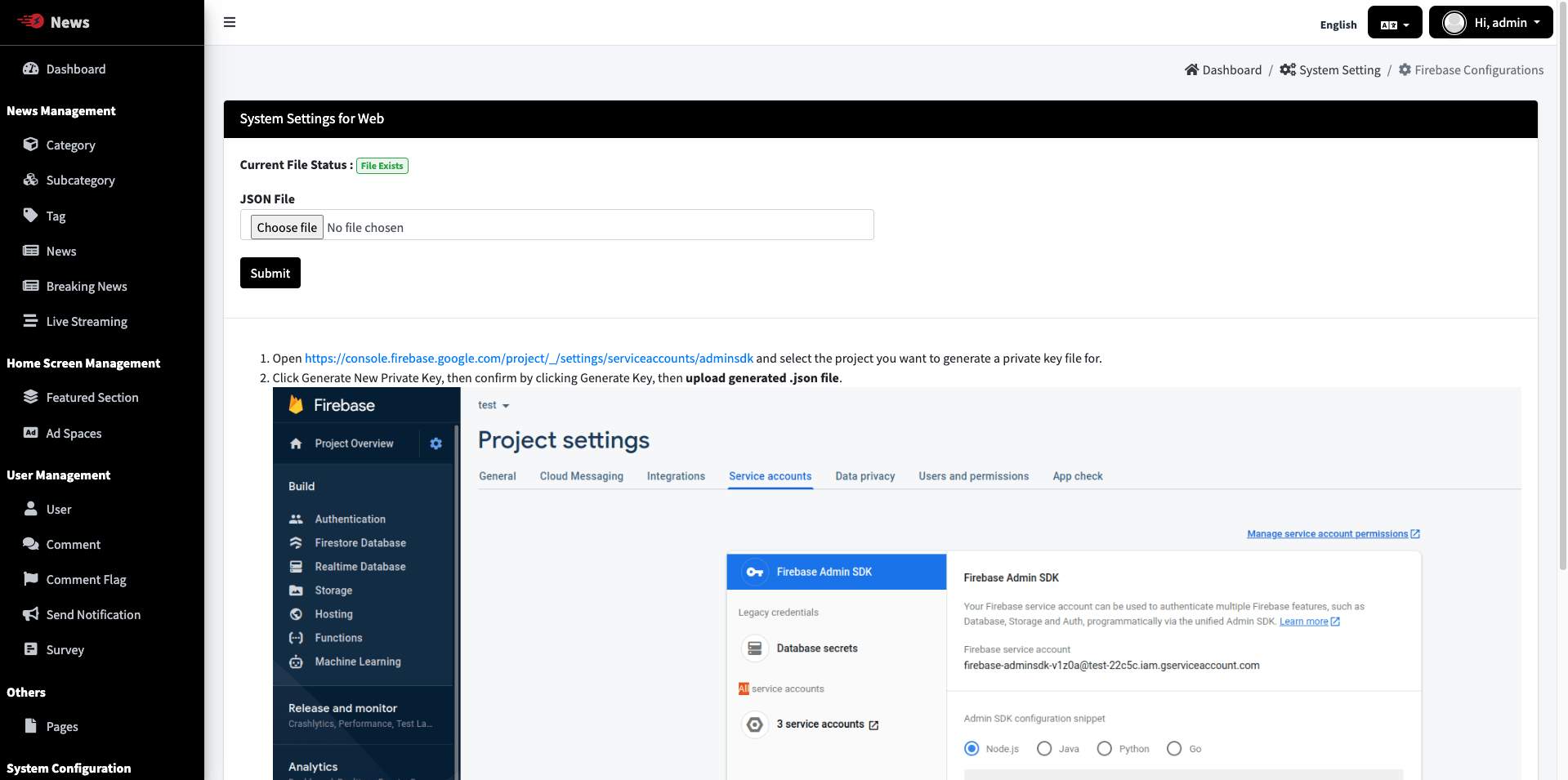 First Of all,we need to Download Private key json file from Service Accounts tab of your Firebase Project & Upload it here in System Setting > Firebase Configurations
