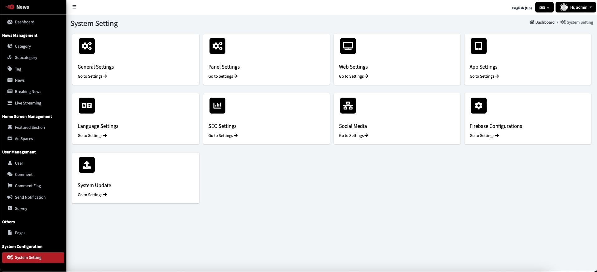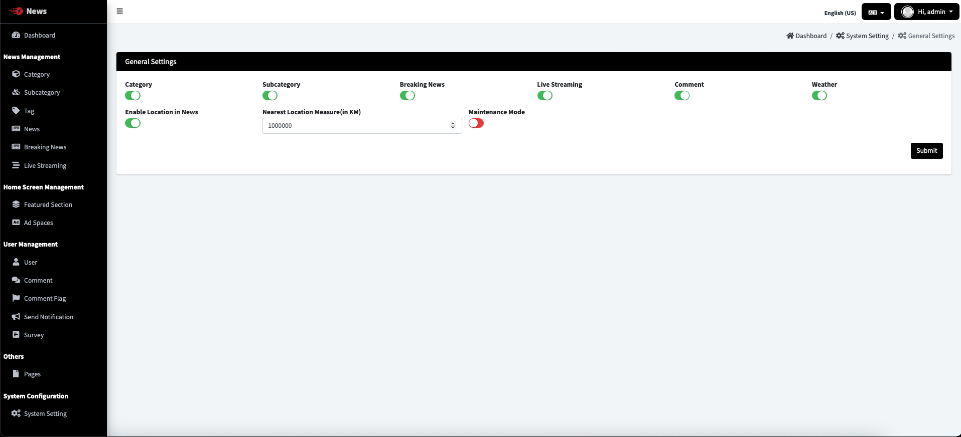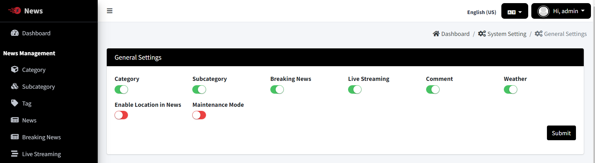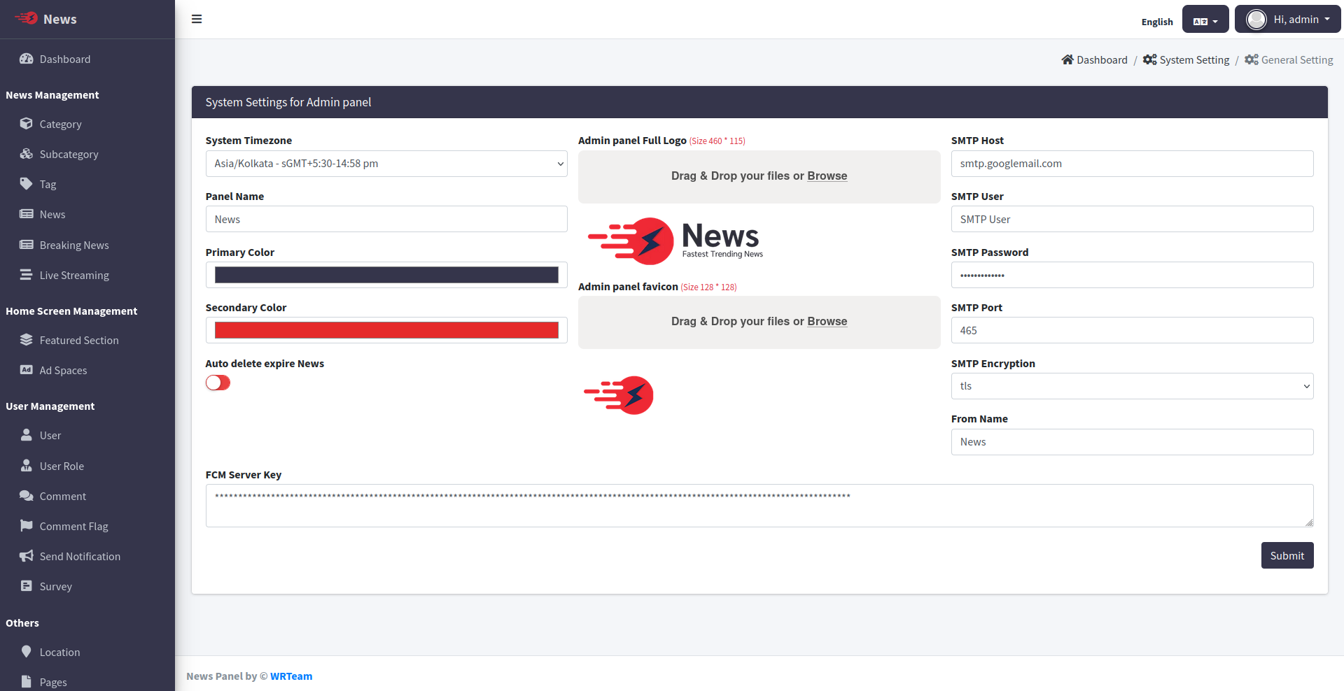 Change the System Timezone, App Name & App Logo of News admin panel. And also Enable / Disable Category, Subcategory, Breaking News, Live Streaming Comments.