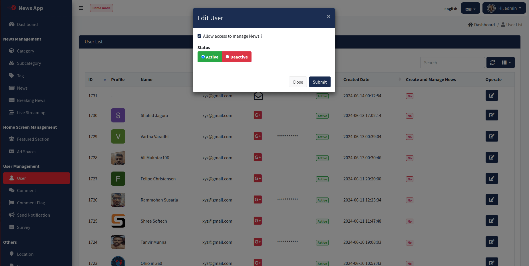 Give Access to Specific User from User List Tab, to Enable Create & Manage News options in App [You will find Create News & Manage News in Profile Settings screen in App].