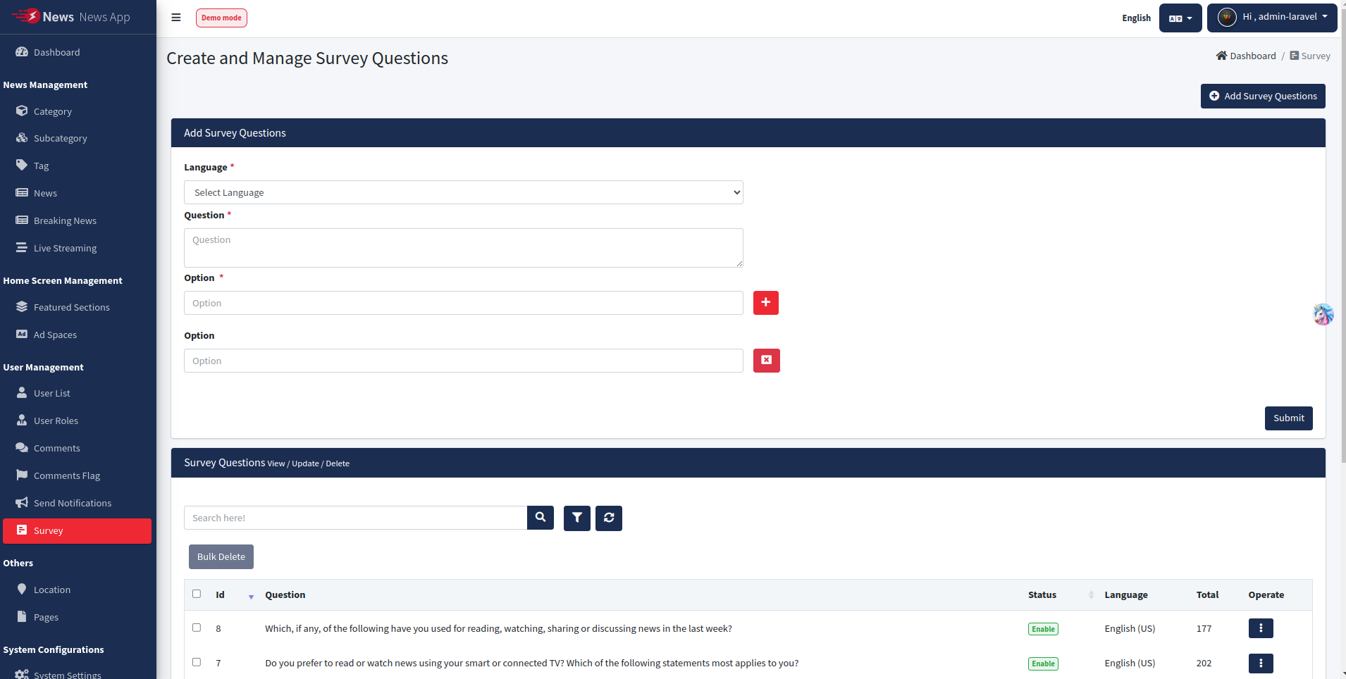 Create and manage Survey Questions for app.