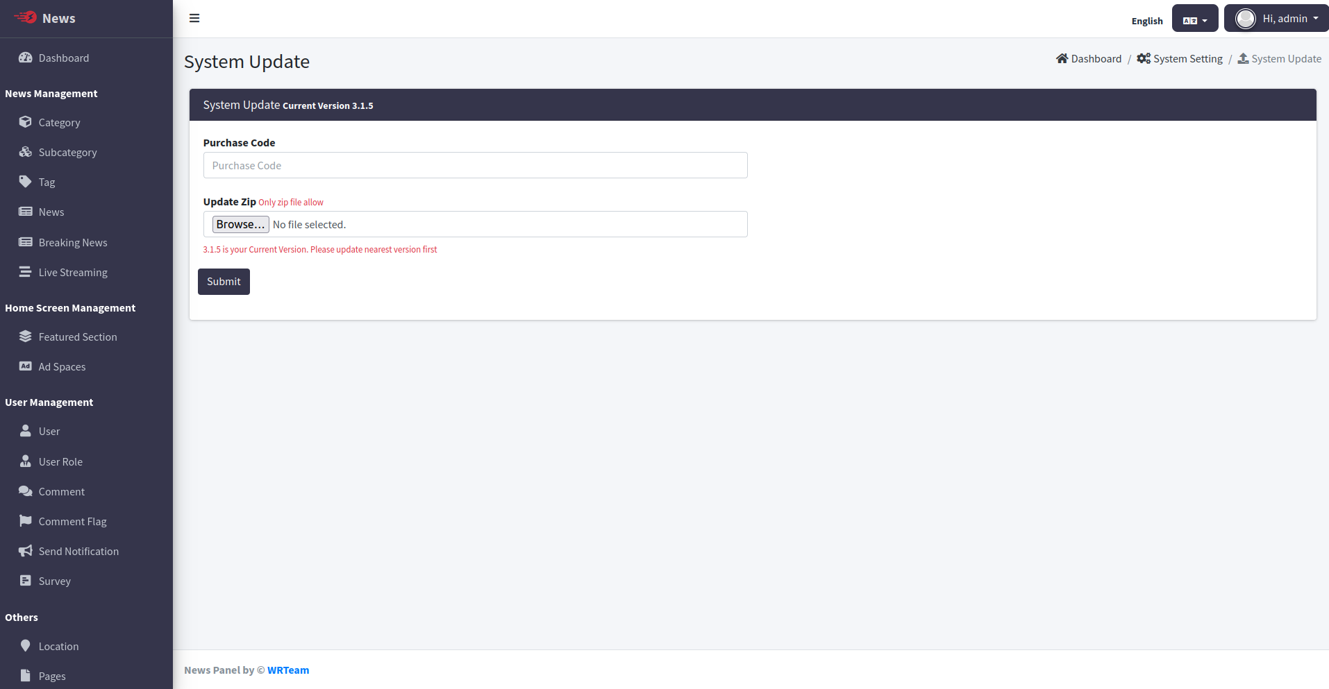 Update system with latest version by uploading zip file.